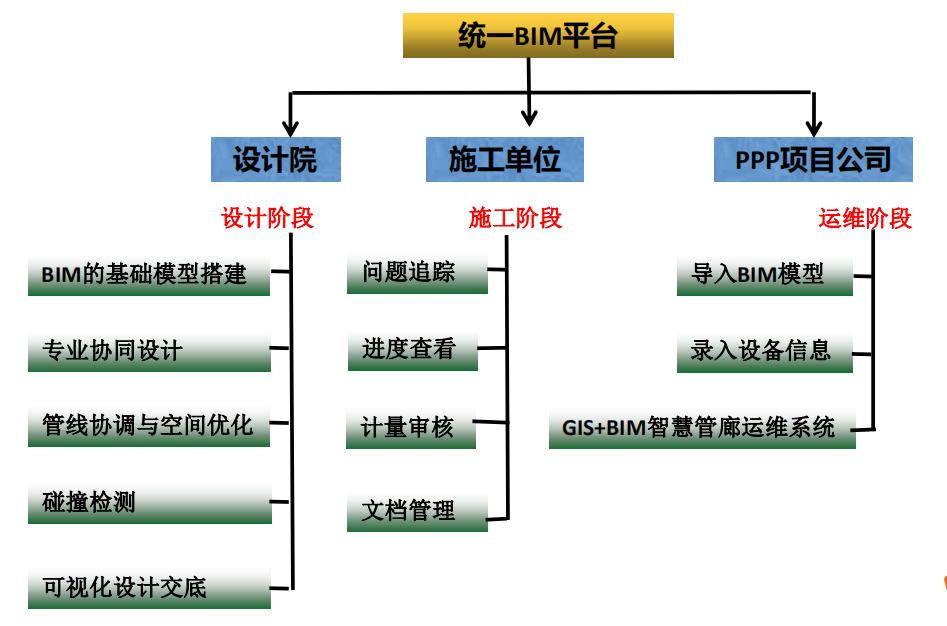 BIM平台建造并以设计单位,施工单位,PPP项目公司“三位一体”的全过程BIM平台。设计阶段侧重BIM模型建模和设计优化;施工阶段侧重多方协同和过程管控;运维阶段侧重数据资产管理,运营分析决策。