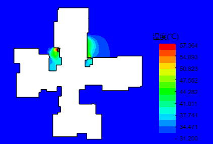 采用性能分析平台进行建筑物和室外机建模,并进行工况参数和模拟参数设置,调用室外机模拟模块进行分析,通过室外机切面功能展示各个关键位置切面温度场和速度场的分布情况,辅助进行判断。