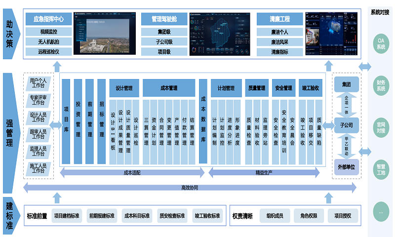 自集团实体化运作起,便聚焦传统管理模式与数字化管理的融合以构建具有区域竞争力国企管理体系。2023年,围绕 “建标准、强管理、助决策” 的核心诉求,启动项目全生命周期管理平台建设。围绕投资、前期、成本、工程等 11 大业务板块,采用 “集团统筹、公司管控、项目执行” 三轮驱动架构,以分层级管理撬动集团工程项目数字化转型,实现管理与决策的科学化、精细化、智慧化。