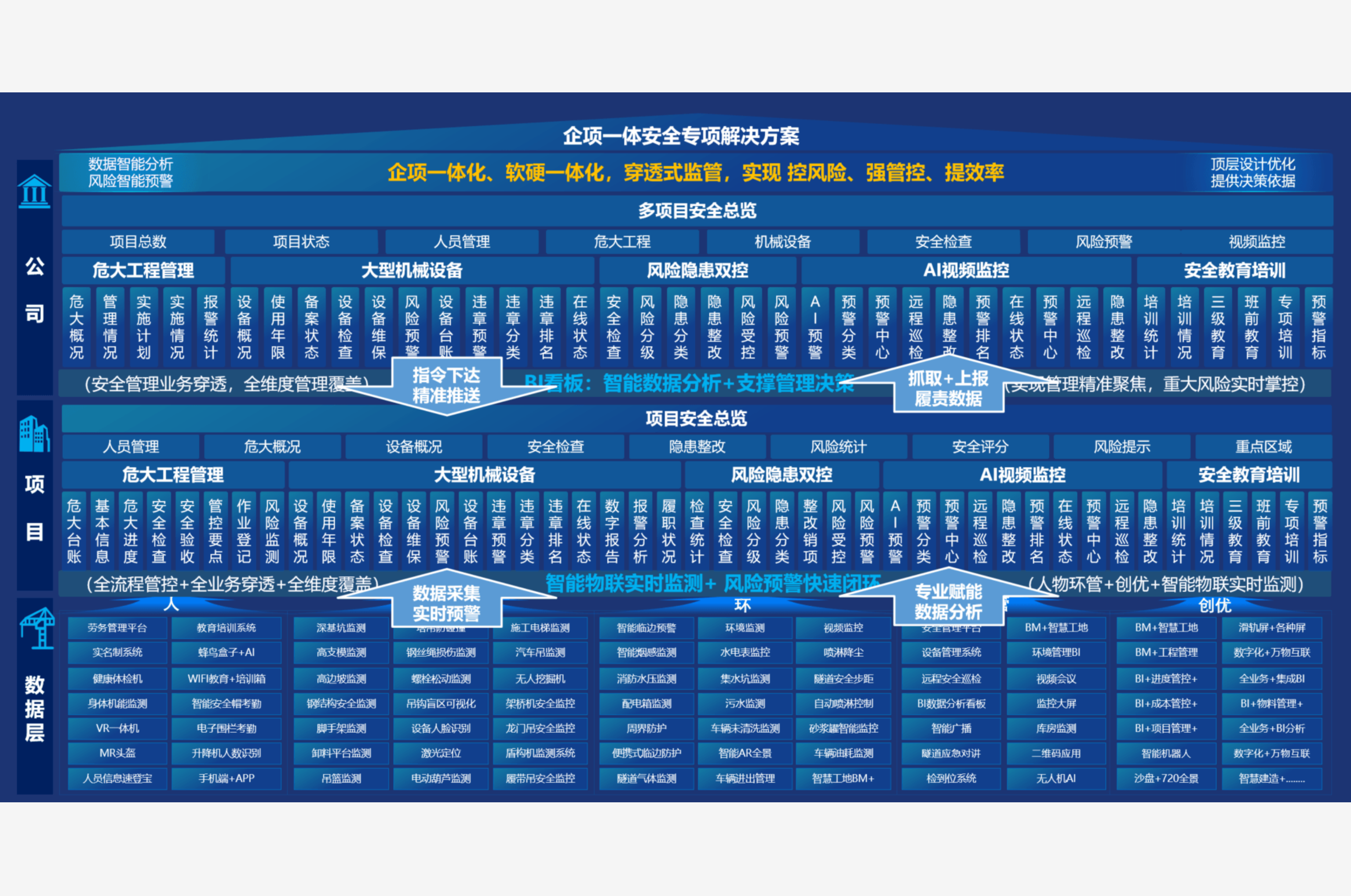 项企一体生产安全决策系统以项企一体、软硬一体为导向,聚焦危大工程、大型机械设备、重大安全风险、视频监控,人员管理、教育培训等安全管理重点关注内容,结合(人-物-环-管)智能物联、AI等新技术应用,实现数据来源多元化、业务管理数字化、重大风险可视化、安全管理精细化的安全穿透式AI监管。 |
