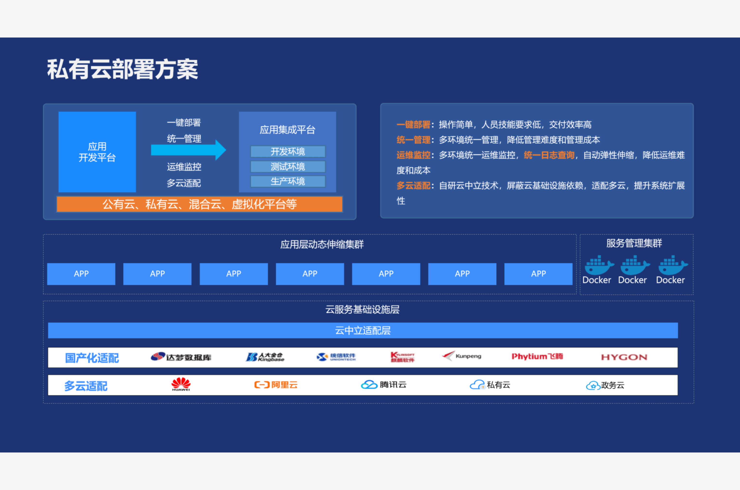 高可靠性和可维护性的私有化部署方案系统采用微服务架构,通过容器化部署方式,整体优势如下: 实现高效的资源利用率,可以在同一台物理机上运行多个应用程序; 提高可靠性和可维护性,容器化技术可以提高应用程序的可靠性和可维护性,从而减少故障率和维护成本; 提高安全性,容器可以提供虚拟化的隔离性,防止不同容器之间的相互影响; |