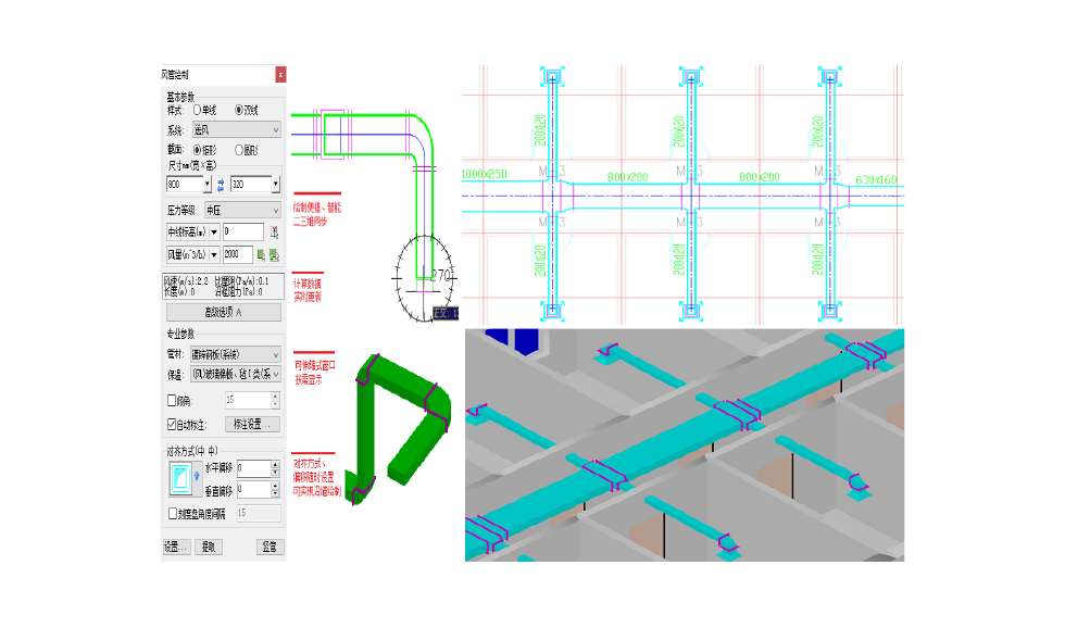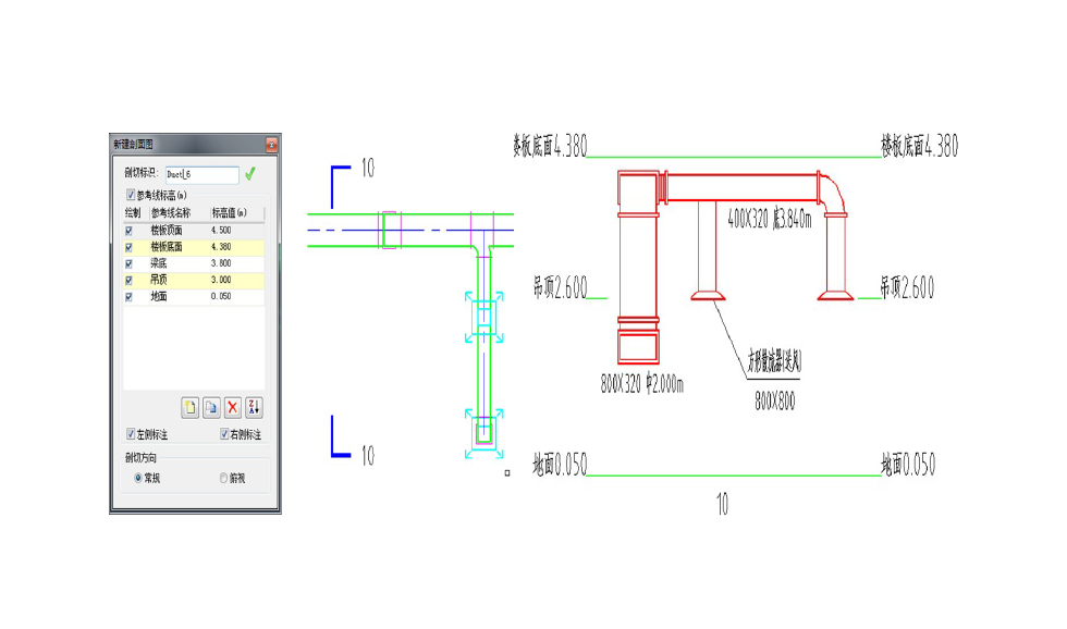 支持不同方式剖切及放大剖切,且修改原图后,剖切图可自动更新联动,剖面图中,支持标注风管尺寸、风口参数等。