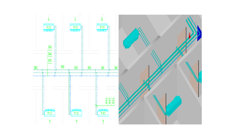 绘制支持各种定位及实时计算阻力等功能;管线与风机盘管等设备可批量连接,自动生系统图;水力计算可直接提取平面图进行计算并赋回;支持单、双线两种模式,可直接编辑互相转换。