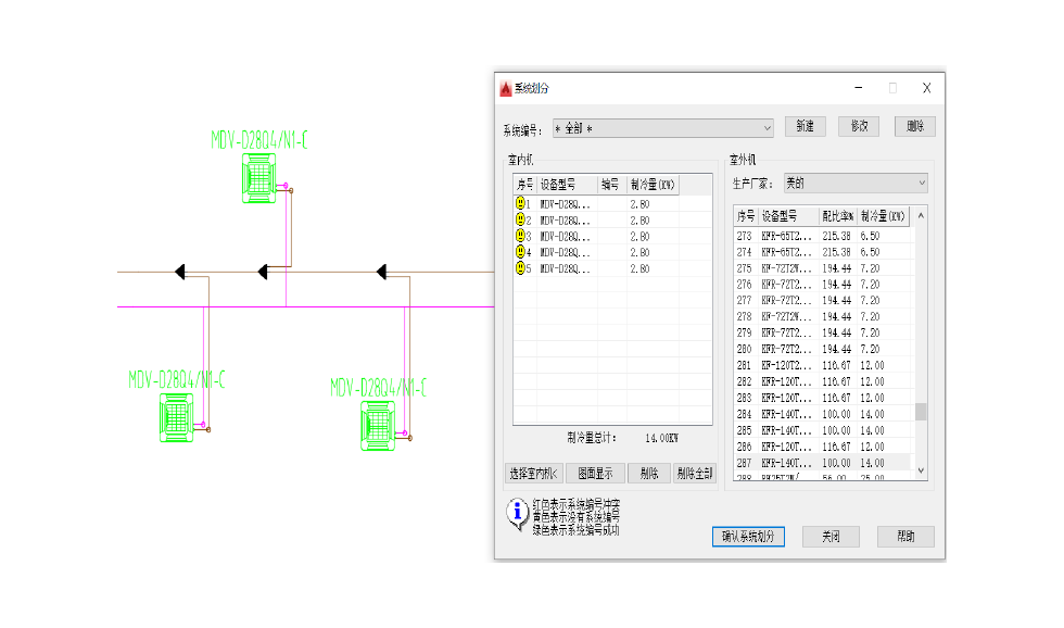 内含设备厂商(软件内含大金、东芝美的等)产品数据库,使用者很方便的行快速设计计算,提供布置设备、管线绘制连接、系统划分计算、生成轴测图系统图、批量修改及标注等功能.