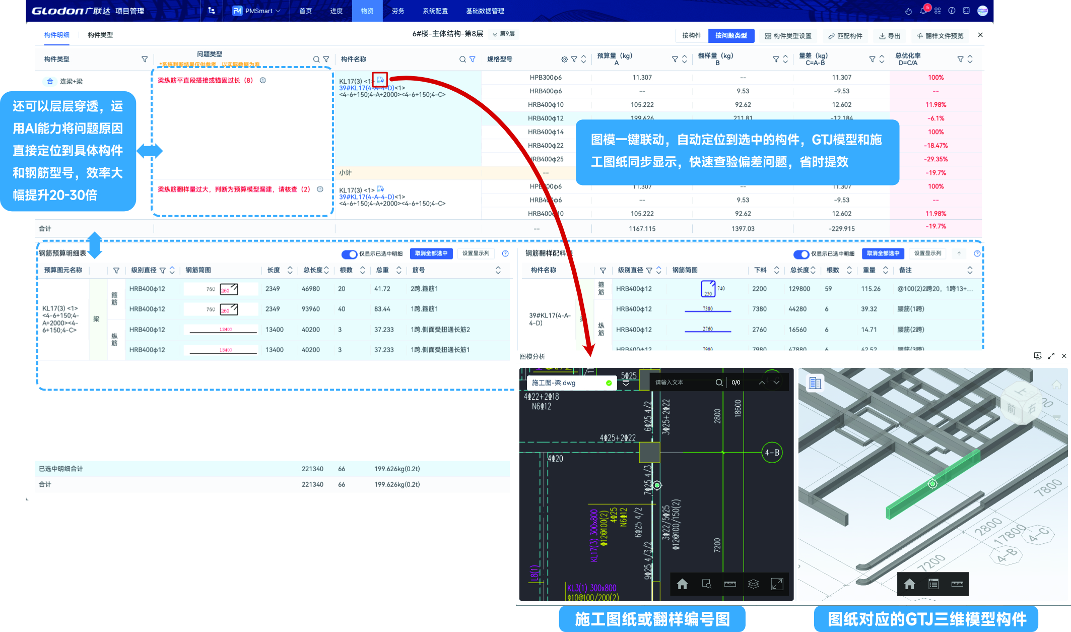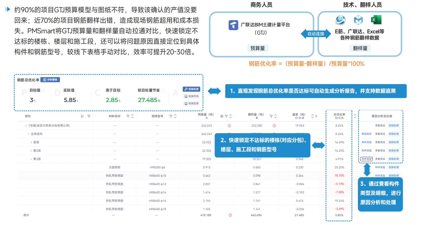 【钢筋优化管理场景】通过图模联动功能,可以一键直达钢筋优化不达标的构件图元所在的图纸与模型,辅助项目快速查验偏差问题根因,相较线下的表格手动对比,效率提升20-30倍。