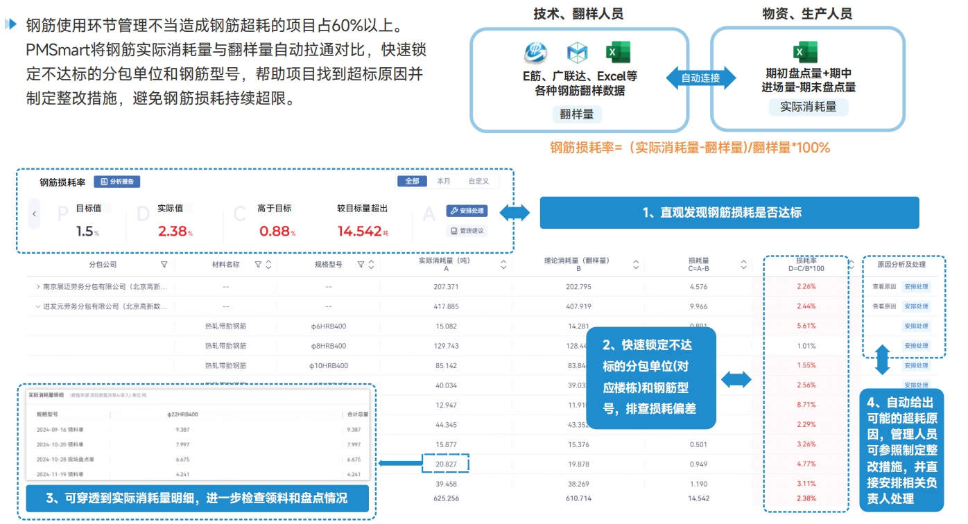 钢筋损耗管理准确锁定钢筋损耗超出限额的责任分包单位,使项目钢筋损耗率降低1%-3% 钢筋使用环节管理不当造成钢筋超耗的项目占60%以上。PMSmart将钢筋实际消耗量与翻样量自动拉通对比,快速锁定不达标的分包单位和钢筋型号,帮助项目找到超标原因并制定整改措施,避免钢筋损耗持续超限。 |