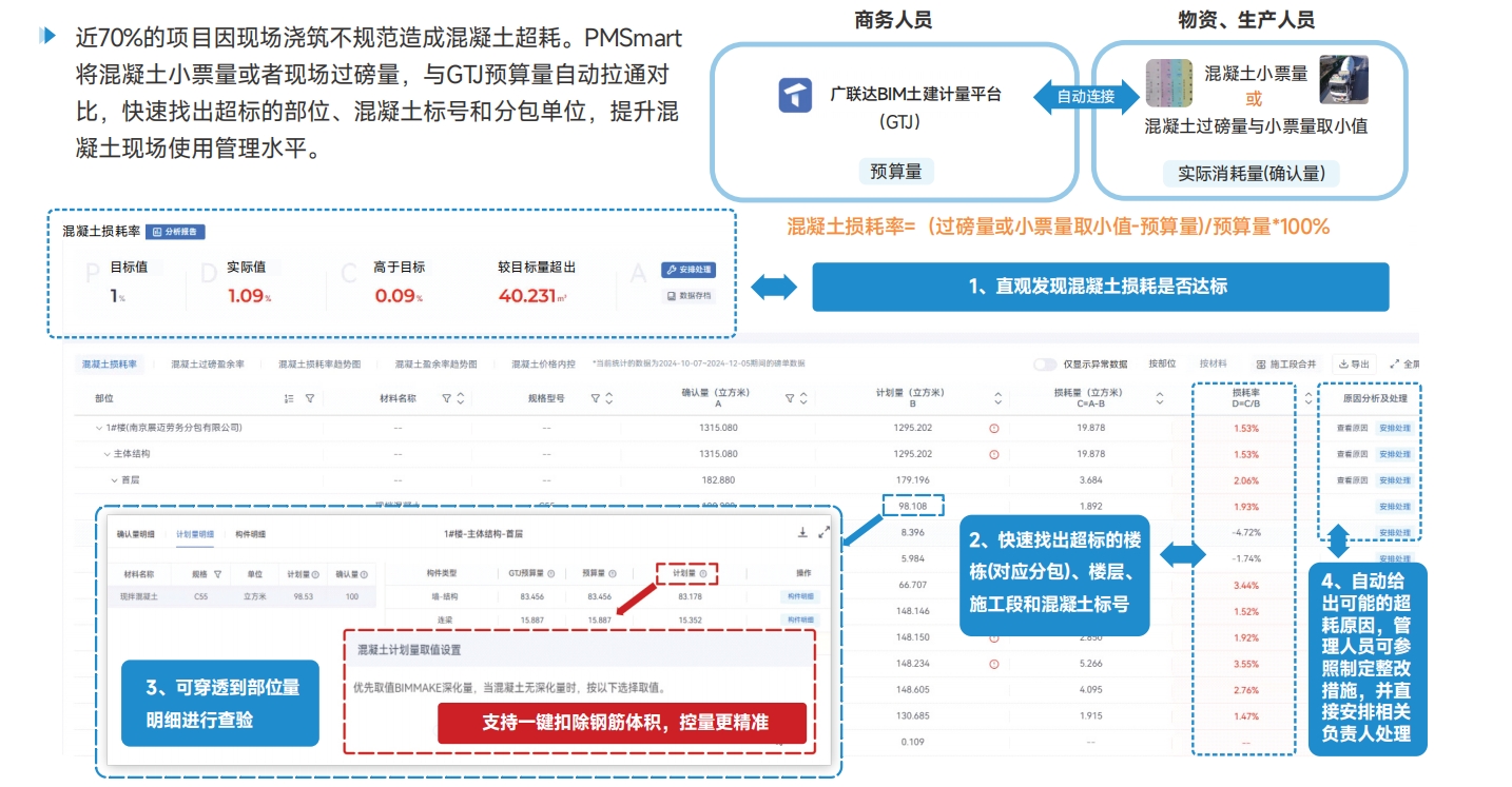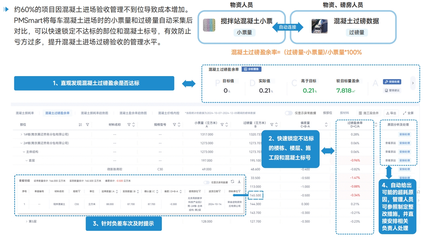 混凝土损耗管理准确定位混凝土超耗部位和责任单位,使项目混凝土损耗率降低2%~3% 近70%的项目因现场浇筑不规范造成混凝土超耗。PMSmart将混凝土小票量或者现场过磅量,与GTJ预算量自动拉通对比,快速找出超标的部位、混凝土标号和分包单位,提升混凝土现场使用管理水平。 |