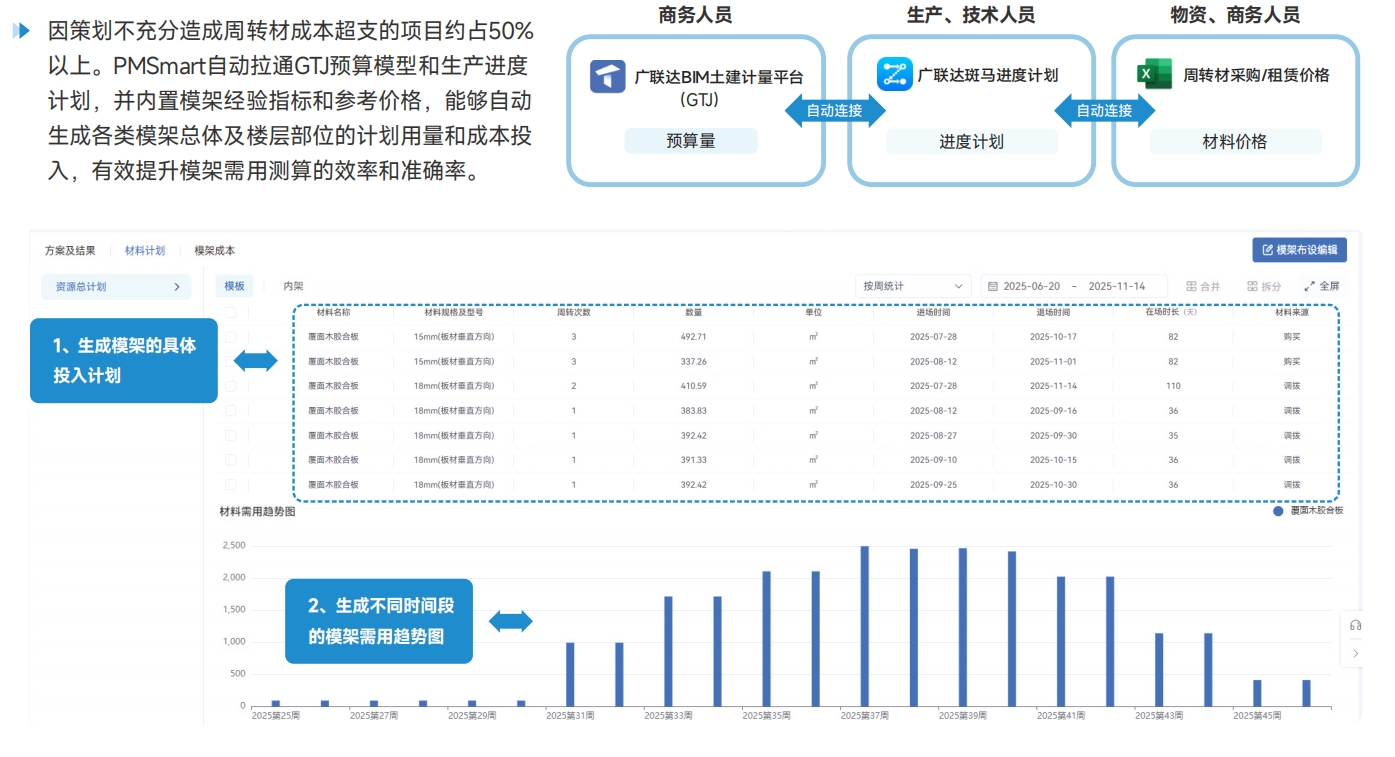 【模架策划场景】PMSmart自动拉通GTJ预算模型和生产进度计划,并内置模架经验指标,能够生成各类模架的总计划用量、各楼层部位模架的投入数量和周转情况!大大提升周转材策划效率及准确度