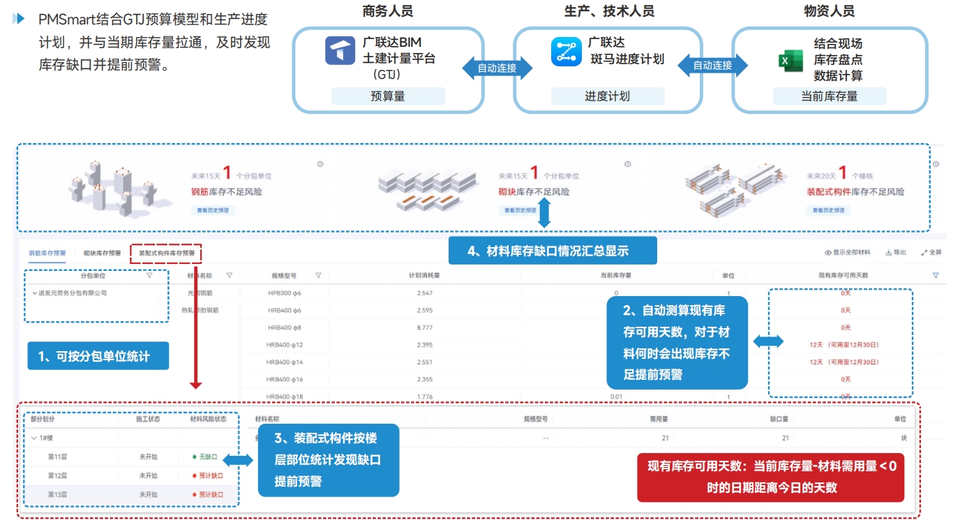 物资缺口分析物资库存不足早发现,降低项目断料停工风险 PMSmart结合GTJ预算模型和生产进度计划,并与当期库存量拉通,及时发现库存缺口并提前预警。 |
