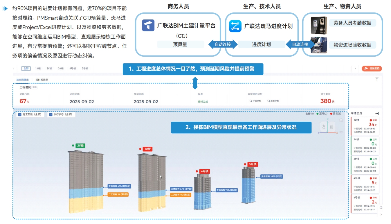 【进度管理场景】PMSmart自动关联了GTJ预算量、斑马进度计划、以及物资和劳务数据,可通过BIM模型,展示各工作面进展及异常状况,还能一键切换单楼栋BIM模型,进度偏差、生产任务和资源匹配情况尽在掌握。