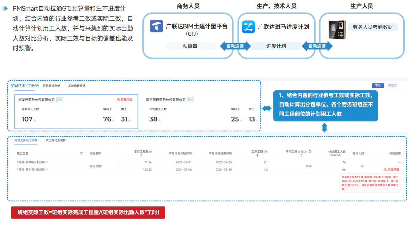 劳动力预测及风险管控提前识别劳动力出勤不足、劳务班组降效导致的工程延期风险 PMSmart自动拉通GTJ预算量和生产进度计划,结合内置的行业参考工效或实际工效,自动计算计划用工人数,并与采集到的实际出勤人数对比分析,实际工效与目标的偏差也能及时预警。 |