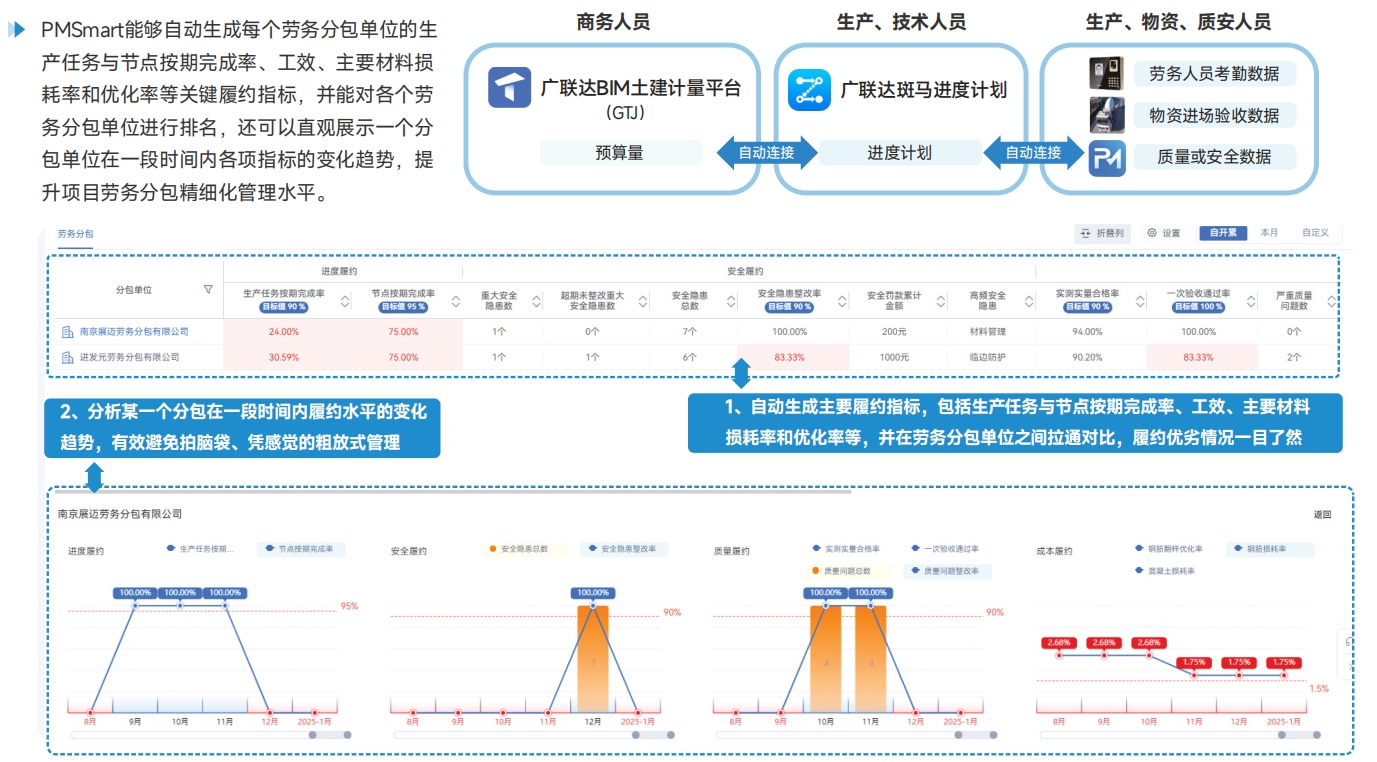 劳务分包履约评价量化掌握分包履约水平,做到履约评价有依据,管理有抓手 PMSmart能够自动生成每个劳务分包单位的生产任务与节点按期完成率、工效、主要材料损耗率和优化率等关键履约指标,并能对各个劳务分包单位进行排名,还可以直观展示一个分包单位在一段时间内各项指标的变化趋势,提升项目劳务分包精细化管理水平。 |