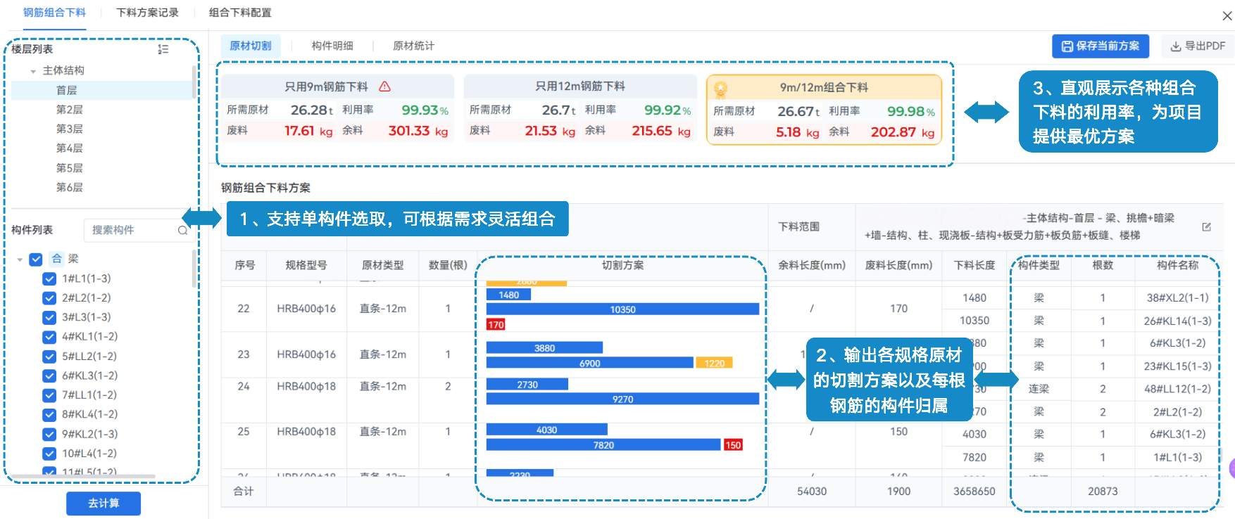 钢筋组合下料最大化利用钢筋原材,为项目平均创效1%以上 PMSmart基于钢筋翻样料单等文件(市面上任何翻样软件生成翻样表格文件都支持快速上传),自动计算生成多种组合下料的方案,帮助项目减少钢筋浪费,实现钢筋利用率最大化。 |