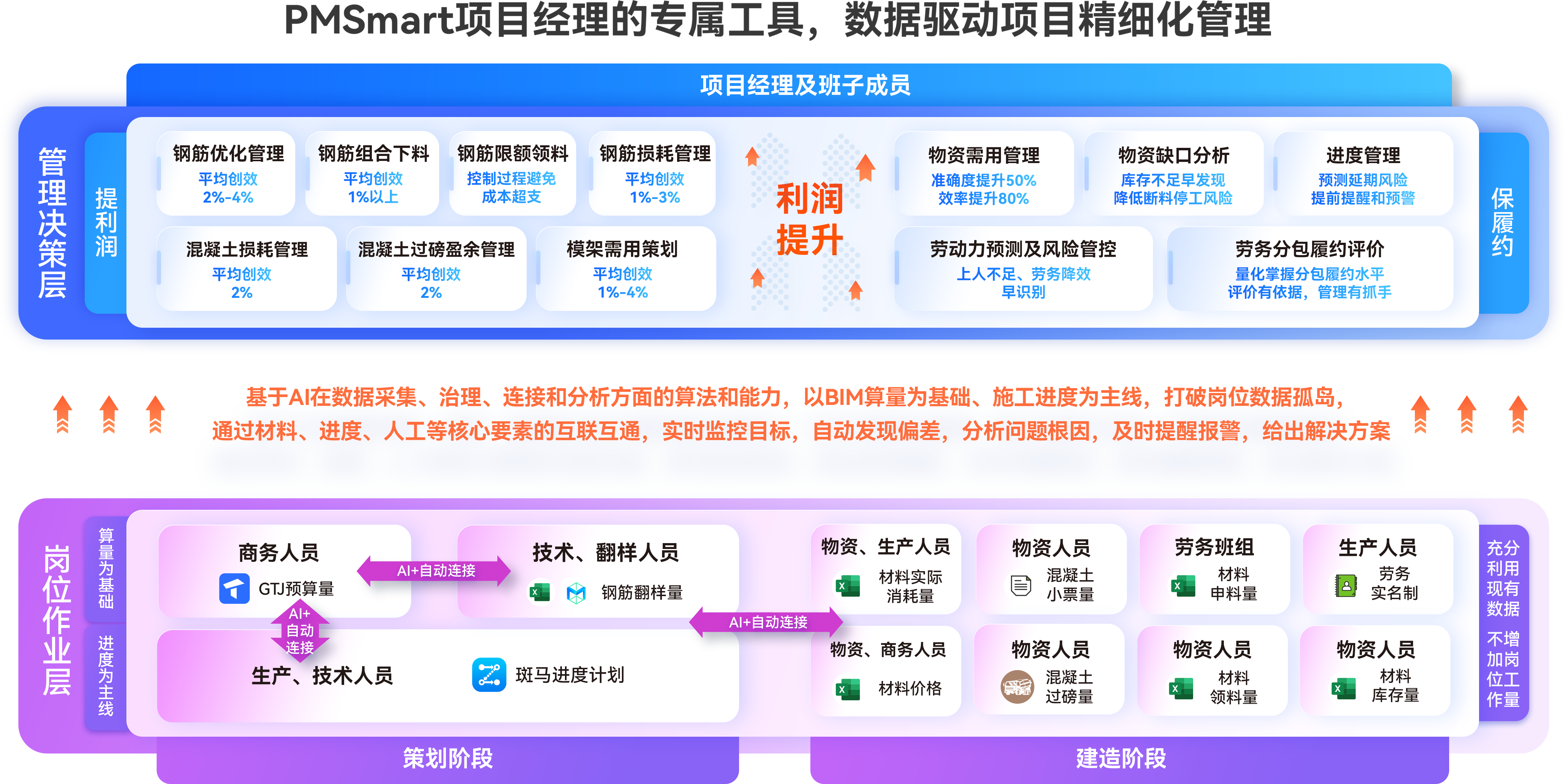 PMSmart通过AI在数据采集、治理、连接、分析决策的能力,自动拉通项目上算量、进度、物资、劳务等各类业务数据,不增加岗位工作量!实现数据的最大化利用!