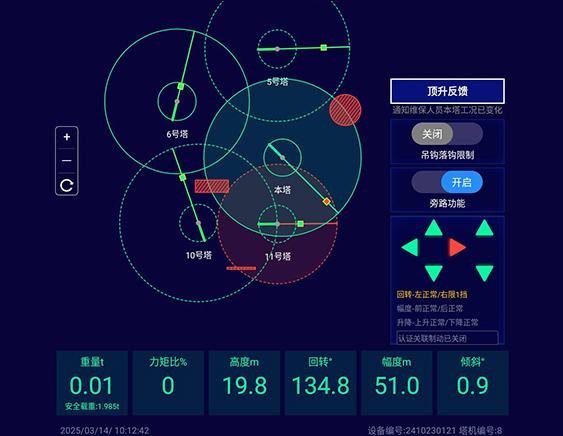 区域限行保护在塔机进入“市政道路、高压线、居民区”等限行区域前及时提醒塔司,进行声光报警,并主动降档减速,避免触及危险区域。