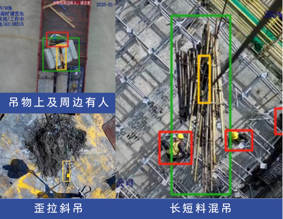 AI十不吊利用 AI-CV 算法结合摄像头和传感器,精准识别工人、吊物、吊钩对象,实时监测并干预“吊物上及周边有人、长短料混吊、歪拉斜吊”的行为,杜绝此类事故隐患发生。